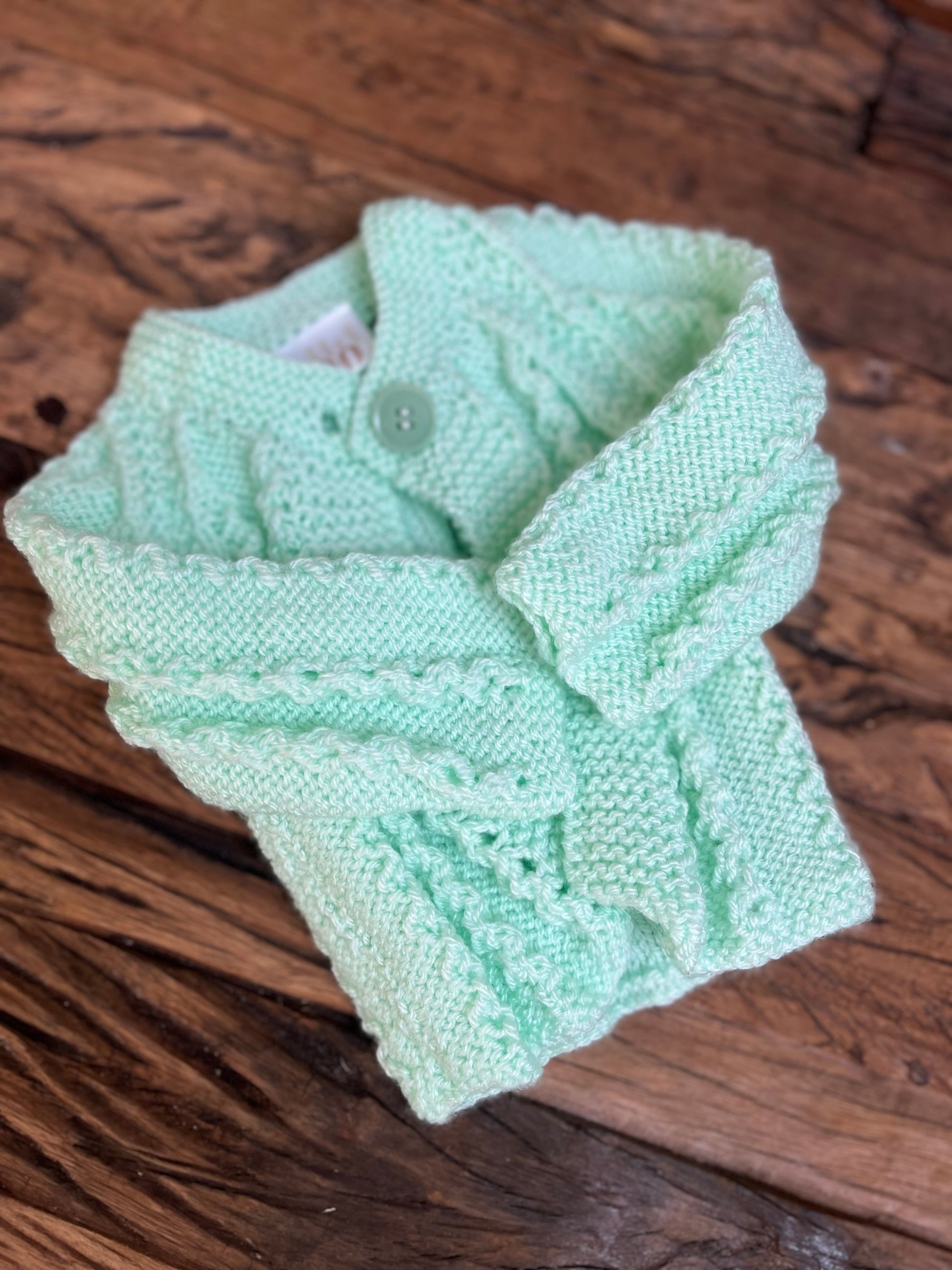 Hand knitted one of a kind mint green cardigan for premature or tiny newborn